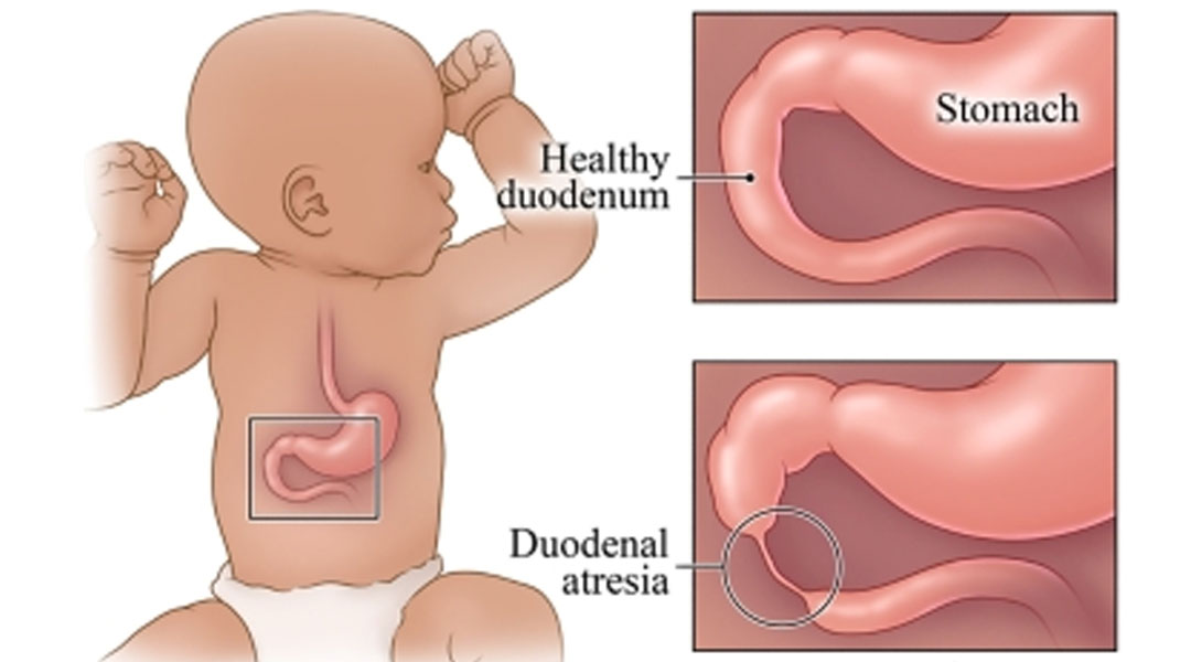 Duodenal Atresia is a congenital (present at birth) condition in which the first part of the small intestine, called the duodenum, is closed or blocked. This prevents the normal passage of stomach contents into the rest of the intestines, leading to serious digestive issues shortly after birth.